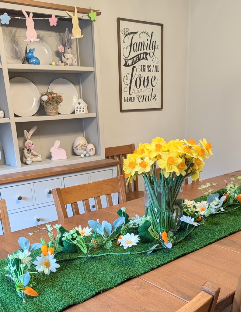 One of my favourite traditions is putting together a beautiful Easter tablescape—even if it’s just for us three. This year’s table is full of fun and floral charm, starting with a base of faux grass table runner to give a garden party feel.