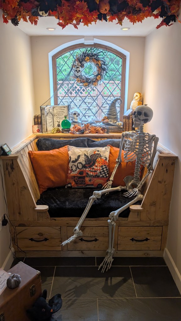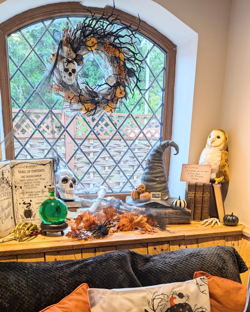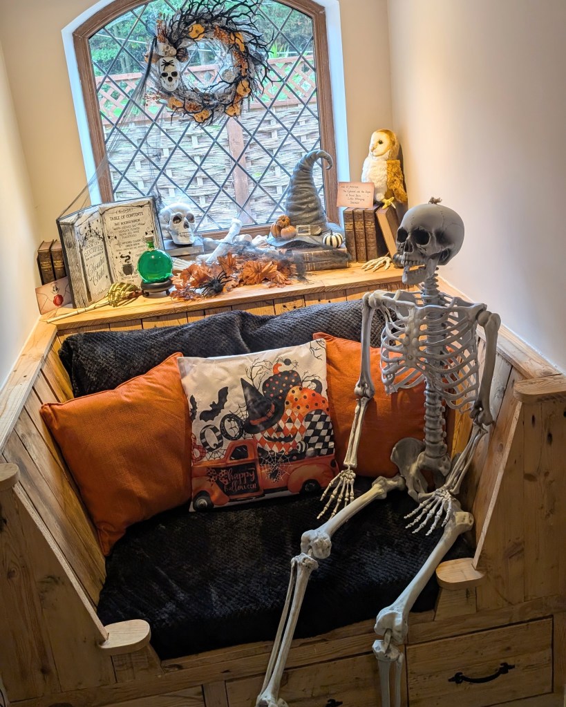 Inside, Skeleton Steve has made himself at home in our window seat — a space that feels a little like the Hogwarts common room this year. There’s a magical mix of pumpkins, potion bottles, spell books, and even a Sorting Hat perched nearby. I’ve added a wand brought back from Harry Potter’s Wizarding World in Universal Studios, autumn leaves, and my skull wreath to pull it all together. It’s the perfect spot for a cosy coffee or for Sophia to sit and read her Halloween books.