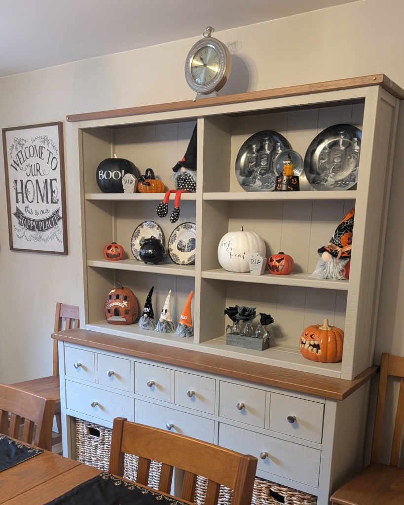 Every corner of our home got a little Halloween sprinkle — from black lace runners and creepy-crawly spiders draped over mirrors, to pumpkins of all sizes tucked onto shelves and beside our log burner. Our dresser has had a festive makeover too, filled with witches, pumpkins, and little “boo crew” gnomes that make me smile every time I walk past.