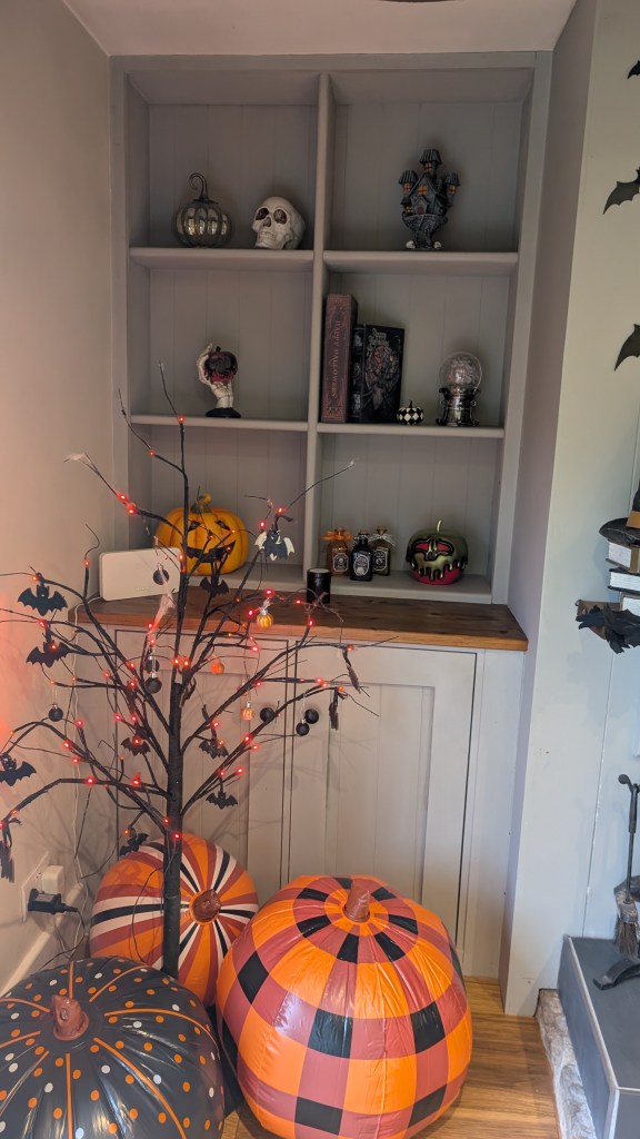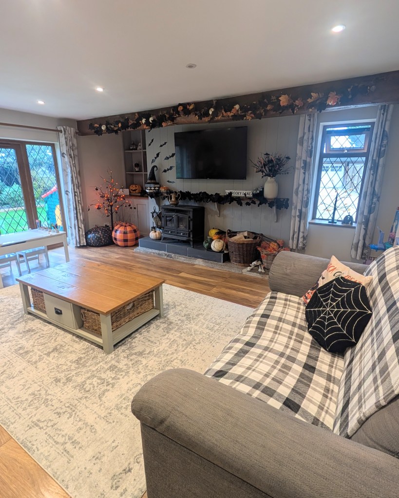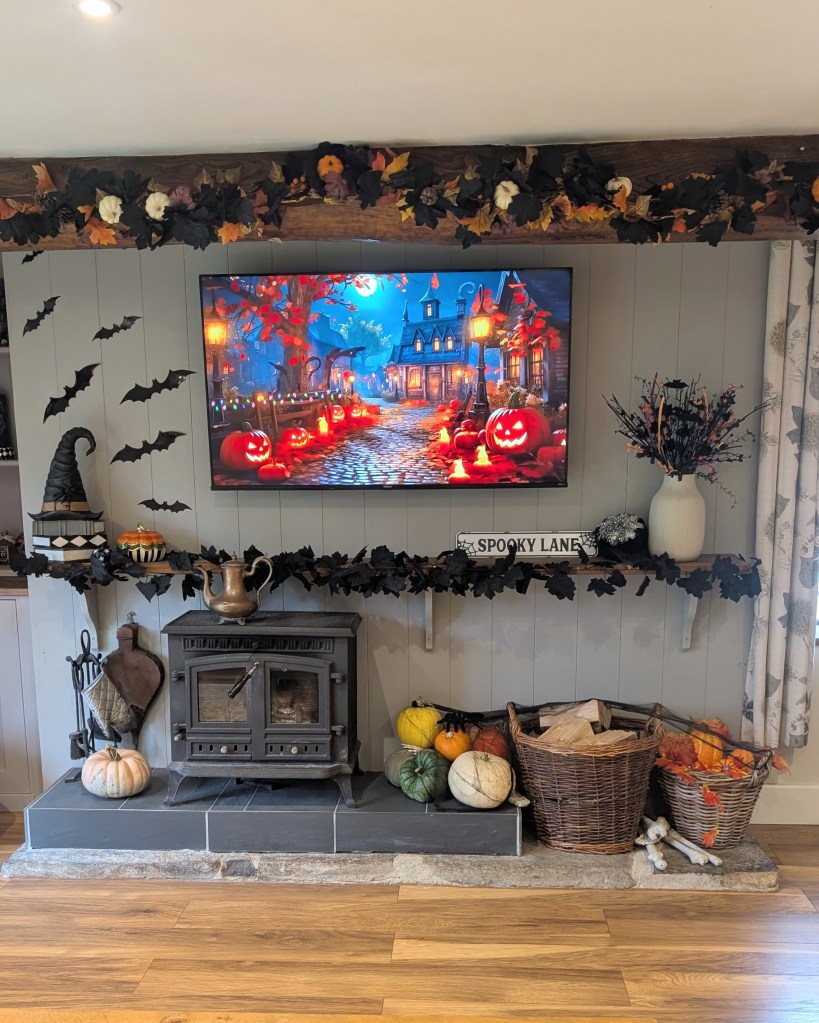 Even the living room got a spooky glow-up — bats flying across the walls, a garland of autumn leaves and black florals draped across the beam, and a mix of real and faux pumpkins creating a rustic, cosy feel. I’ve been playing a looping Halloween village scene on the TV, which makes the whole space feel like a living postcard from “Spooky Lane.
