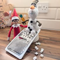 Olaf “melting” through a cheese grater, leaving behind mini marshmallow snowflakes.